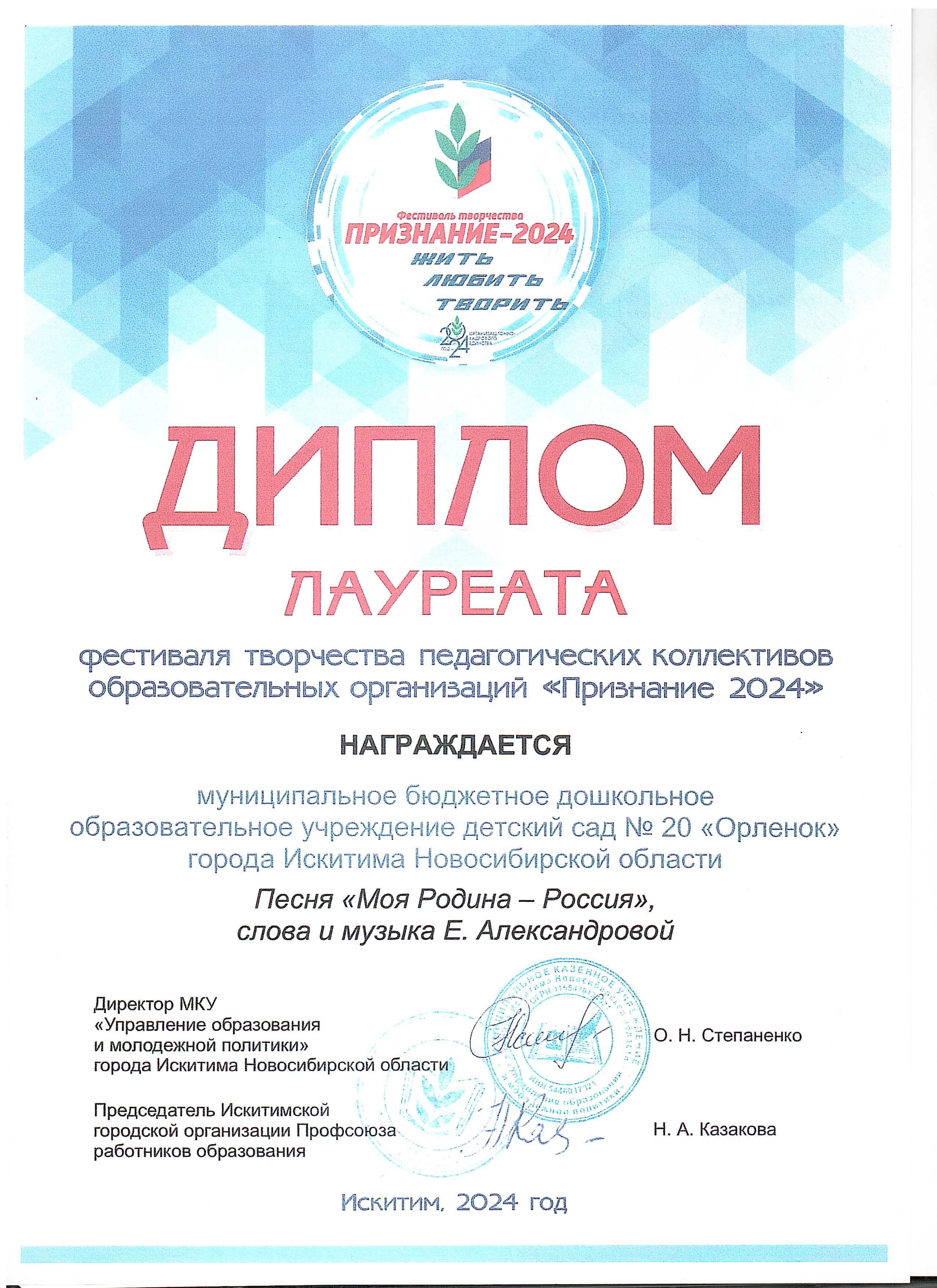 Диплом лауреата фестиваля творчества педагогических коллективов образовательных организаций "Признание 2024"