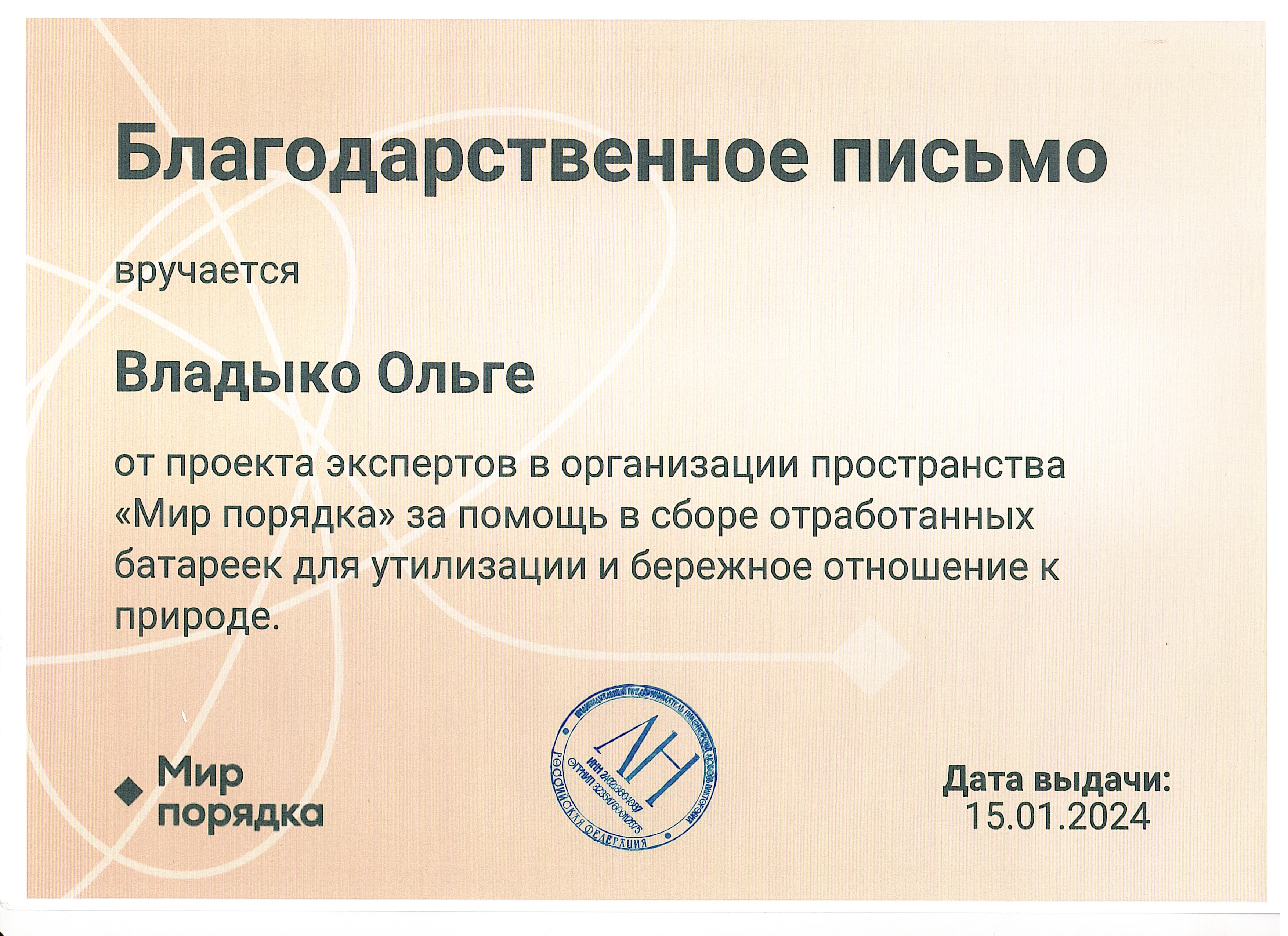 Благодарственное письмо от проекта "Мир порядка" за помощь в сборе отработанных батареек для утилизации.