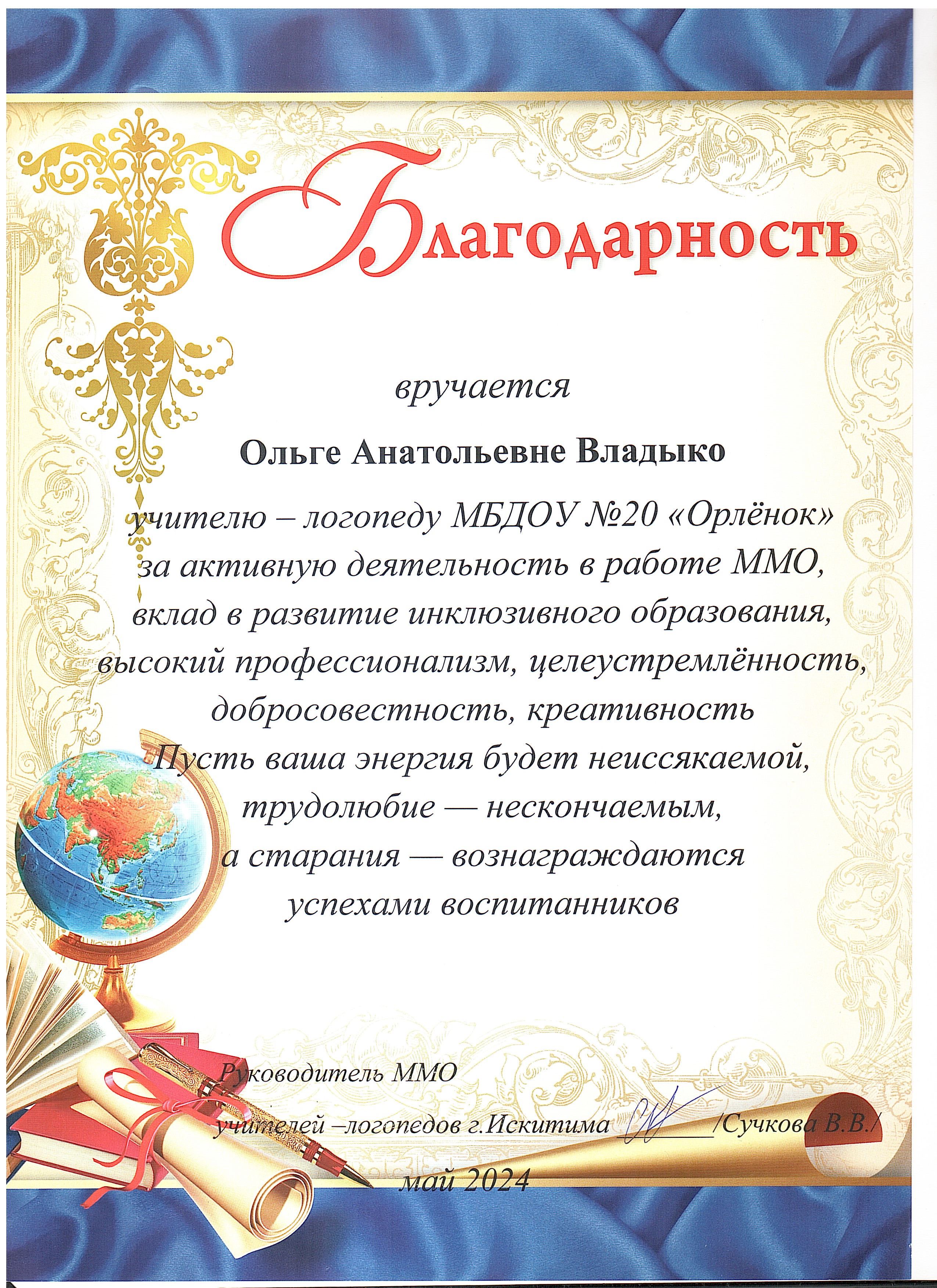 Благодарность за активную деятельность в работе ММО учителей-логопедов г. Искитима