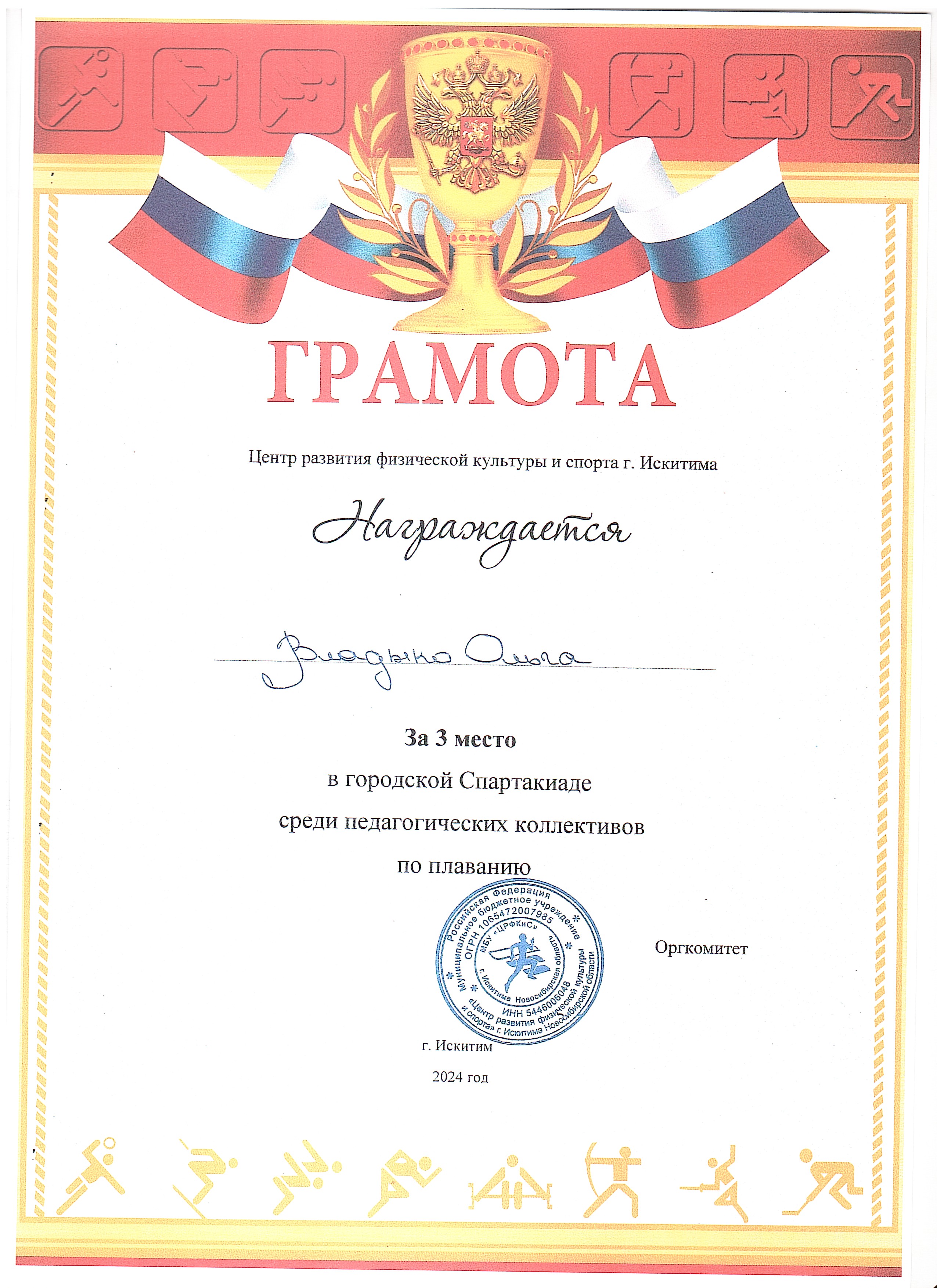 Грамота за 3 место в личном зачете по плаванию в городской Спартакиаде среди педагогических коллективов города Искитима