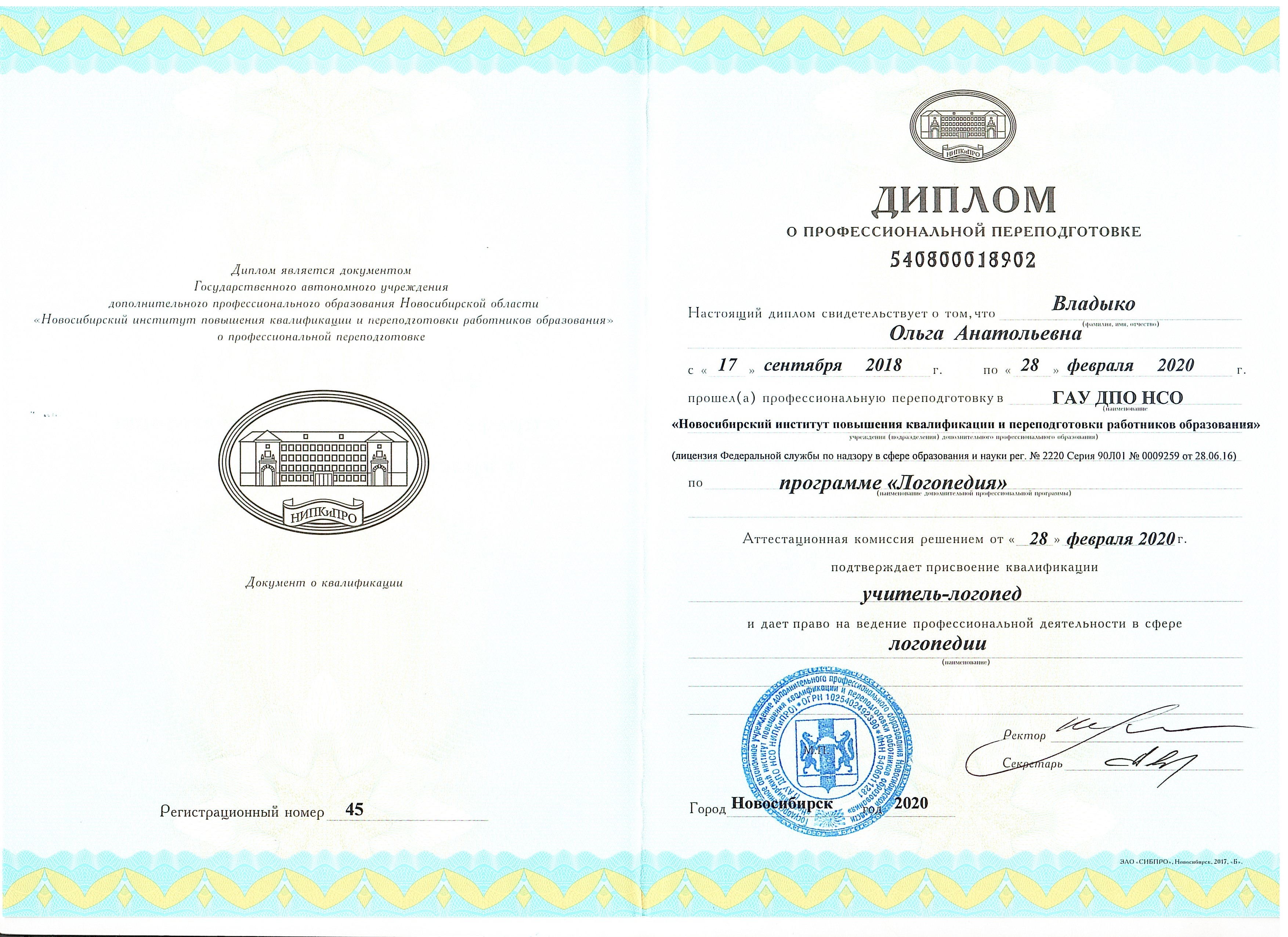 Диплом о профессиональной подготовке по программе "Логопедия"